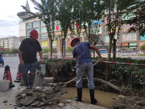 9月9日,我們跟隨搶修車輛來到了今天的第一站:乾坤商務(wù)酒店門口,由于管道漏水,現(xiàn)場不斷有水從地底滲出,加上地點特殊我們搶修工只能用鐵鍬等工具將道路破開,再找出破損位置,對管道進行更換維護處理。